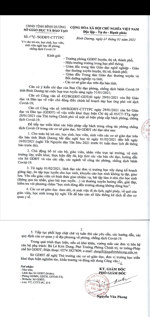 Thời gian nghỉ kéo dài tới hết lịch nghỉ Tết Nguyên đán Tân Sửu 2021 đã thông báo trước đó, tức là đến hết ngày 16/2/2021 (Sở sẽ có văn bản thông báo sớm nhất).