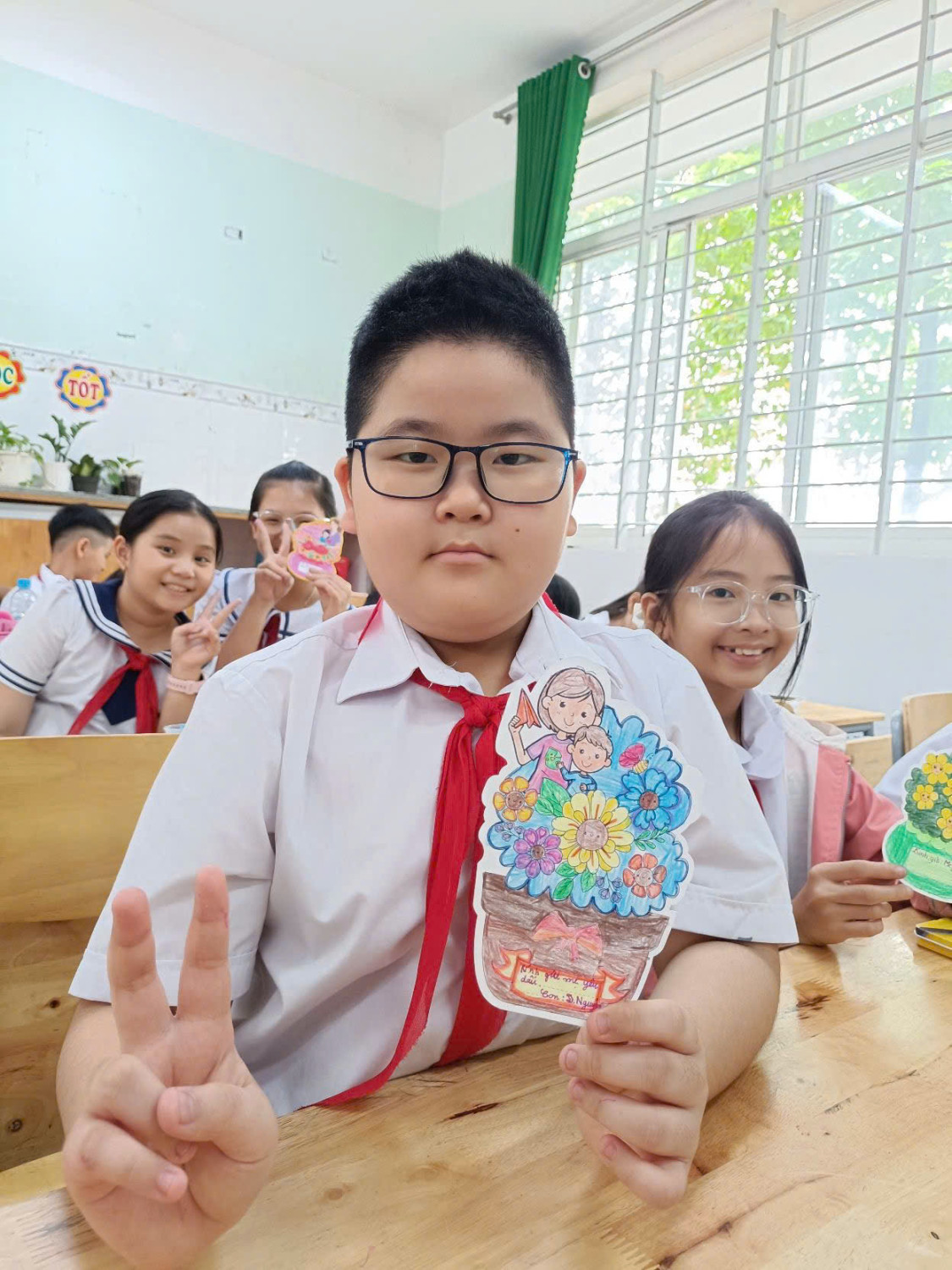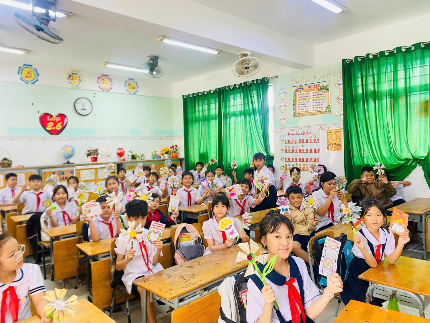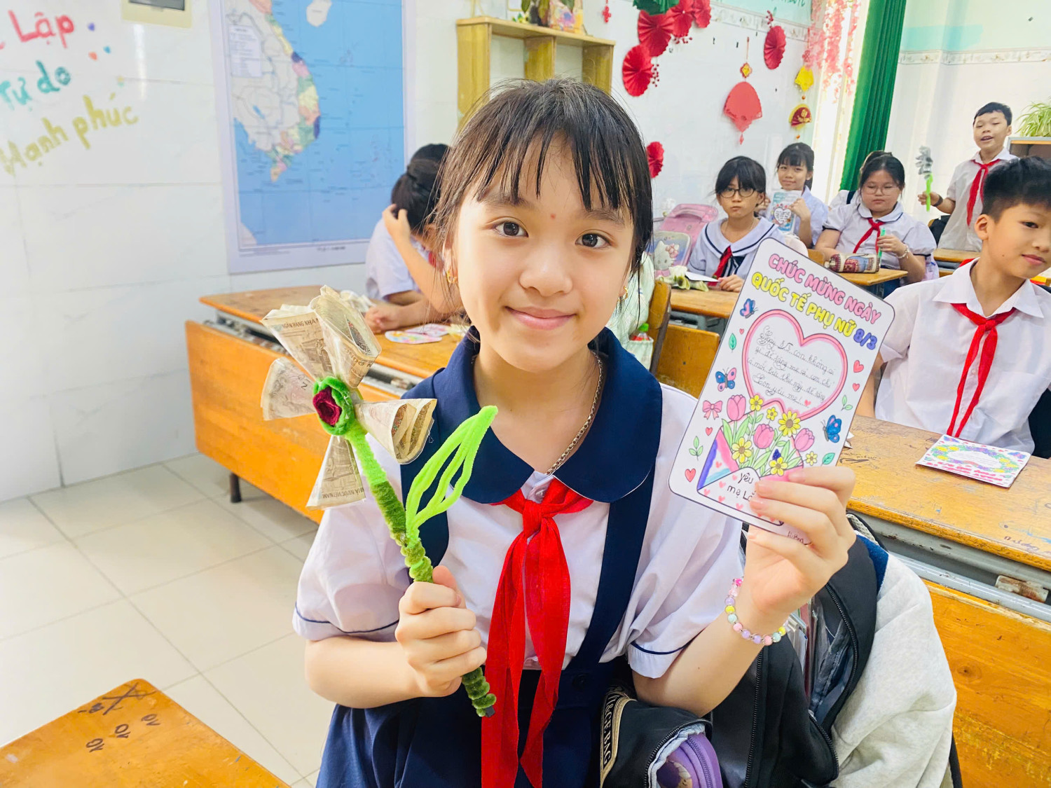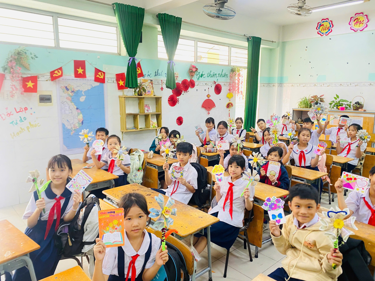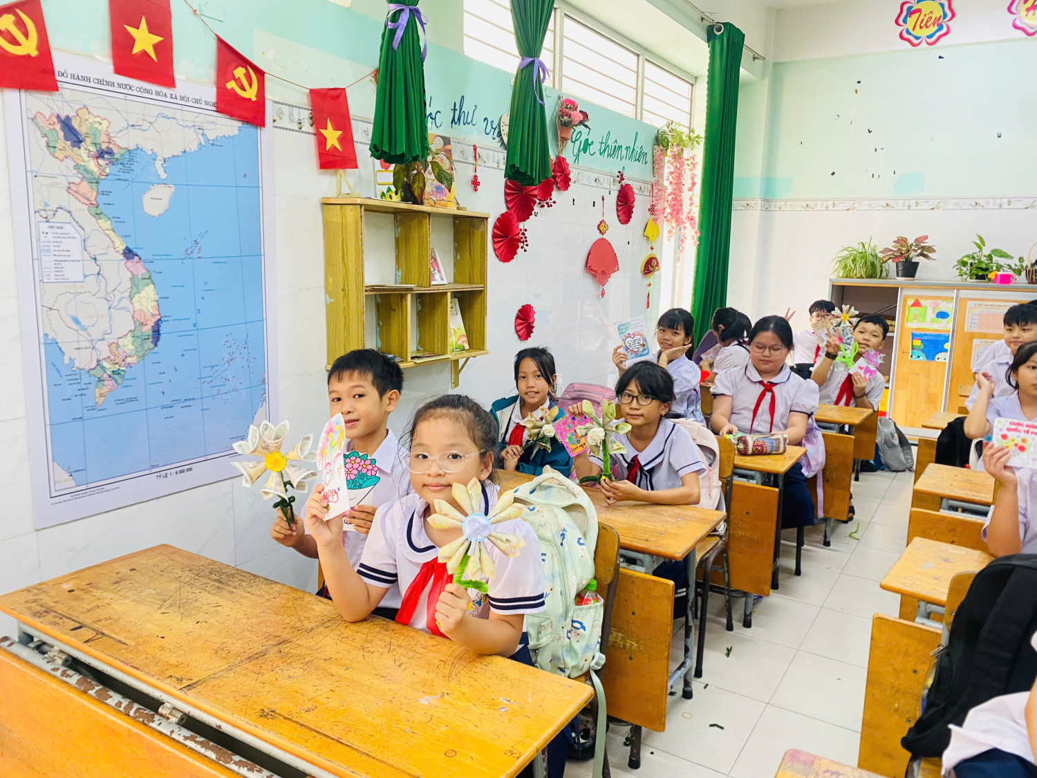 Bên cạnh đó, học sinh còn tự làm những bông hoa thủ công từ giấy màu, ống hút hoặc các vật liệu tái chế. Dưới đôi bàn tay khéo léo và sự hướng dẫn tận tình của giáo viên, những bông hoa tuy giản đơn nhưng chứa đựng rất nhiều yêu thương.