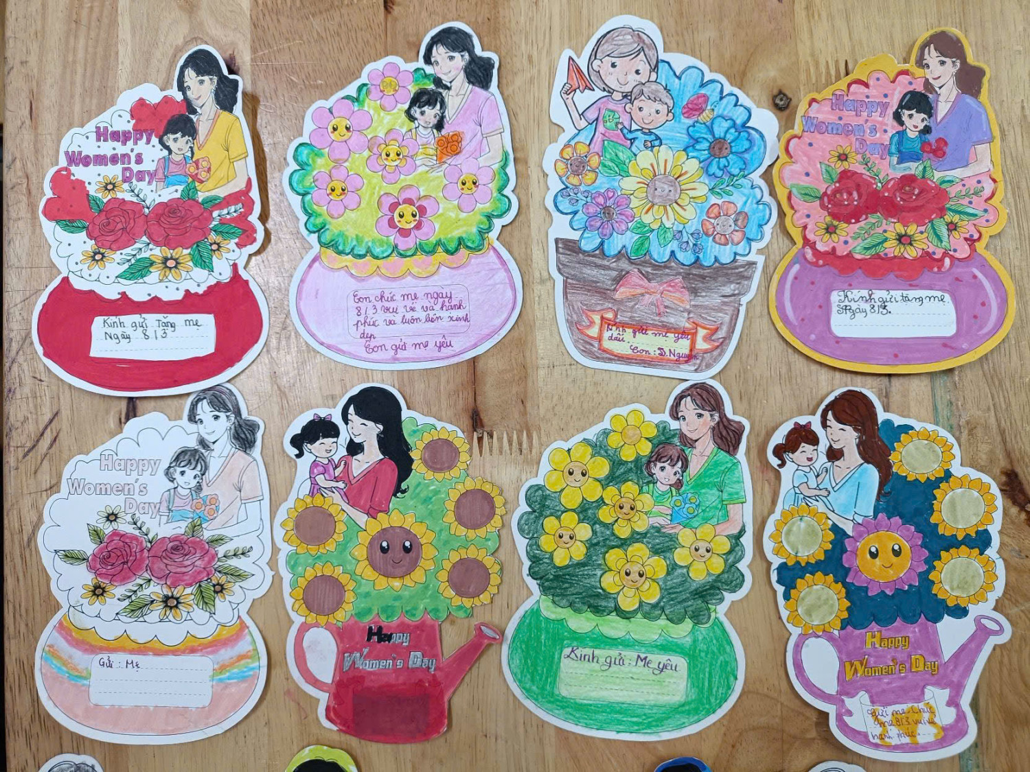 Trong hoạt động này, các em đã được tự tay làm những tấm thiệp xinh xắn với nhiều màu sắc và hình ảnh sinh động. Trên mỗi tấm thiệp là những lời chúc giản dị nhưng chân thành như: “Con yêu mẹ”, “Con chúc mẹ luôn khỏe mạnh”… thể hiện tình cảm trong sáng và lòng biết ơn của các em dành cho mẹ.