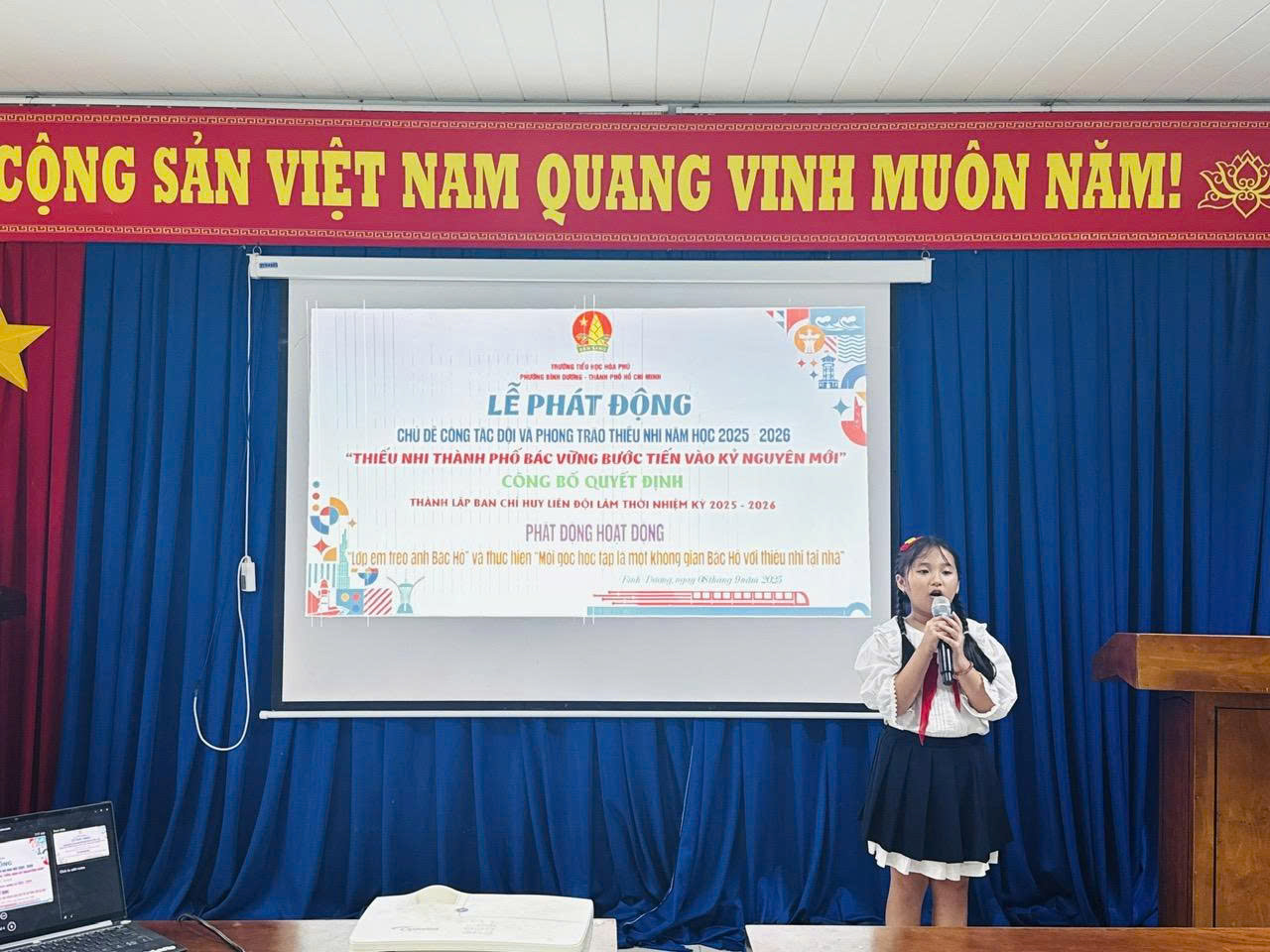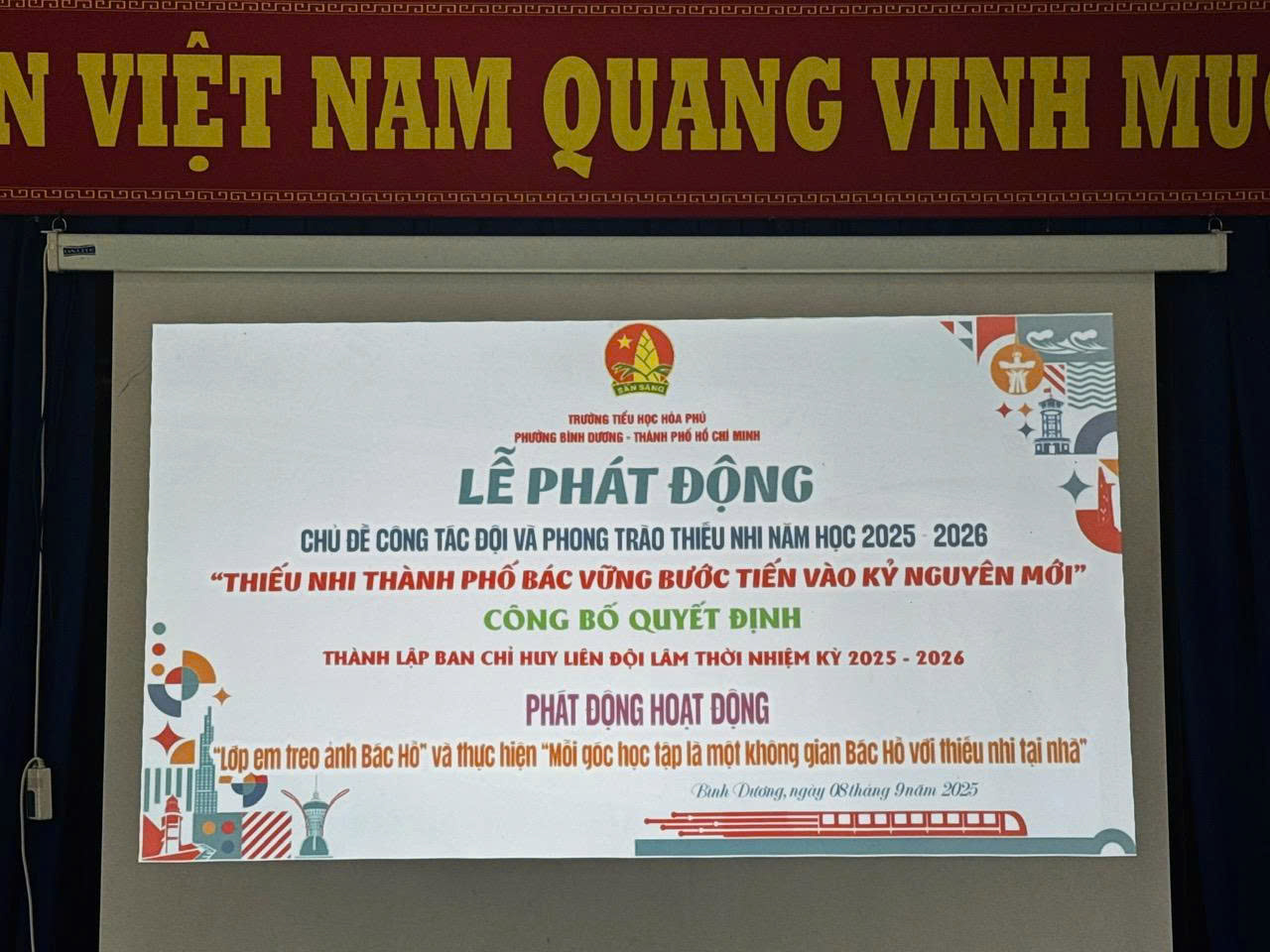 Sáng ngày 08/9/2025, Liên đội Trường Tiểu học Hòa Phú đã long trọng tổ chức Lễ phát động chủ đề Công tác Đội và phong trào Thiếu nhi năm học 2025 - 2026 với chủ đề: “Thiếu nhi Thành phố Bác vững bước tiến vào kỷ nguyên mới”. Đồng thời, ra mắt Chi đội và BCH liên đội lâm thời năm học 2025 - 2026.