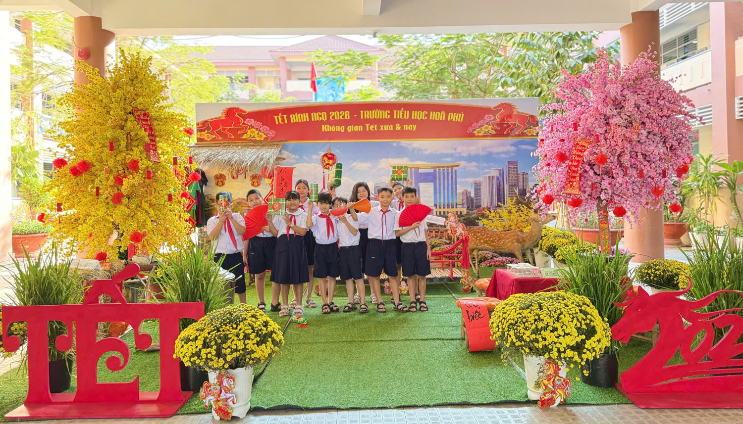 Không gian Tết xưa được tái hiện sinh động với hình ảnh bánh chưng xanh, mâm ngũ quả, câu đối đỏ, bàn trà, nồi bánh chưng… mang đậm nét truyền thống dân tộc. Bên cạnh đó, khu vực Tết nay được trang trí hiện đại, tươi sáng với hoa mai, hoa đào, tiểu cảnh xuân, bao lì xì… tạo nên bức tranh mùa xuân đầy màu sắc.