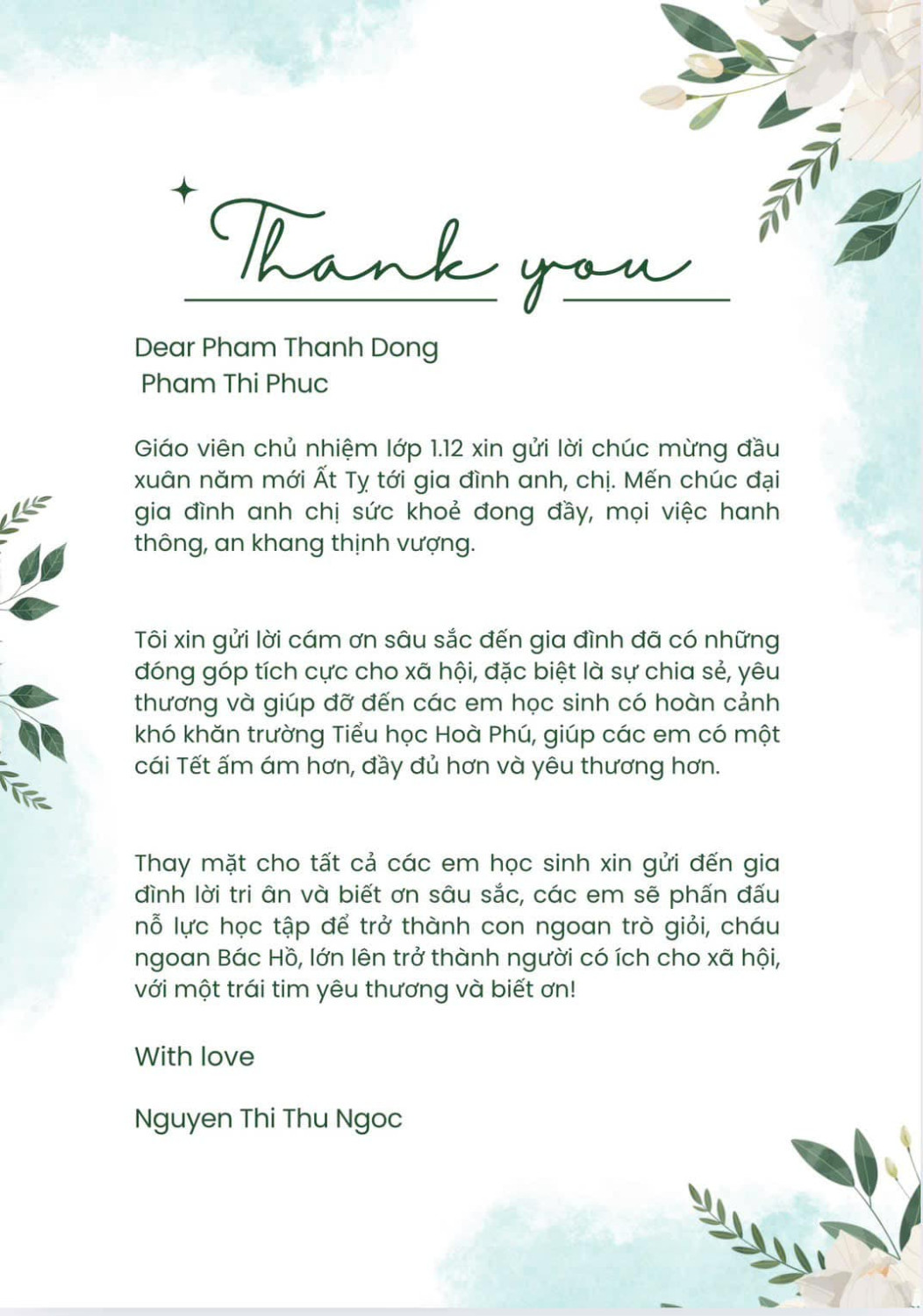 Ban giám hiệu nhà trường cùng toàn thể giáo viên và các em học sinh xin gửi đến quý nhà hảo tâm, mạnh thường quân lời chúc sức khoẻ và lời cảm ơn chân thành nhất.