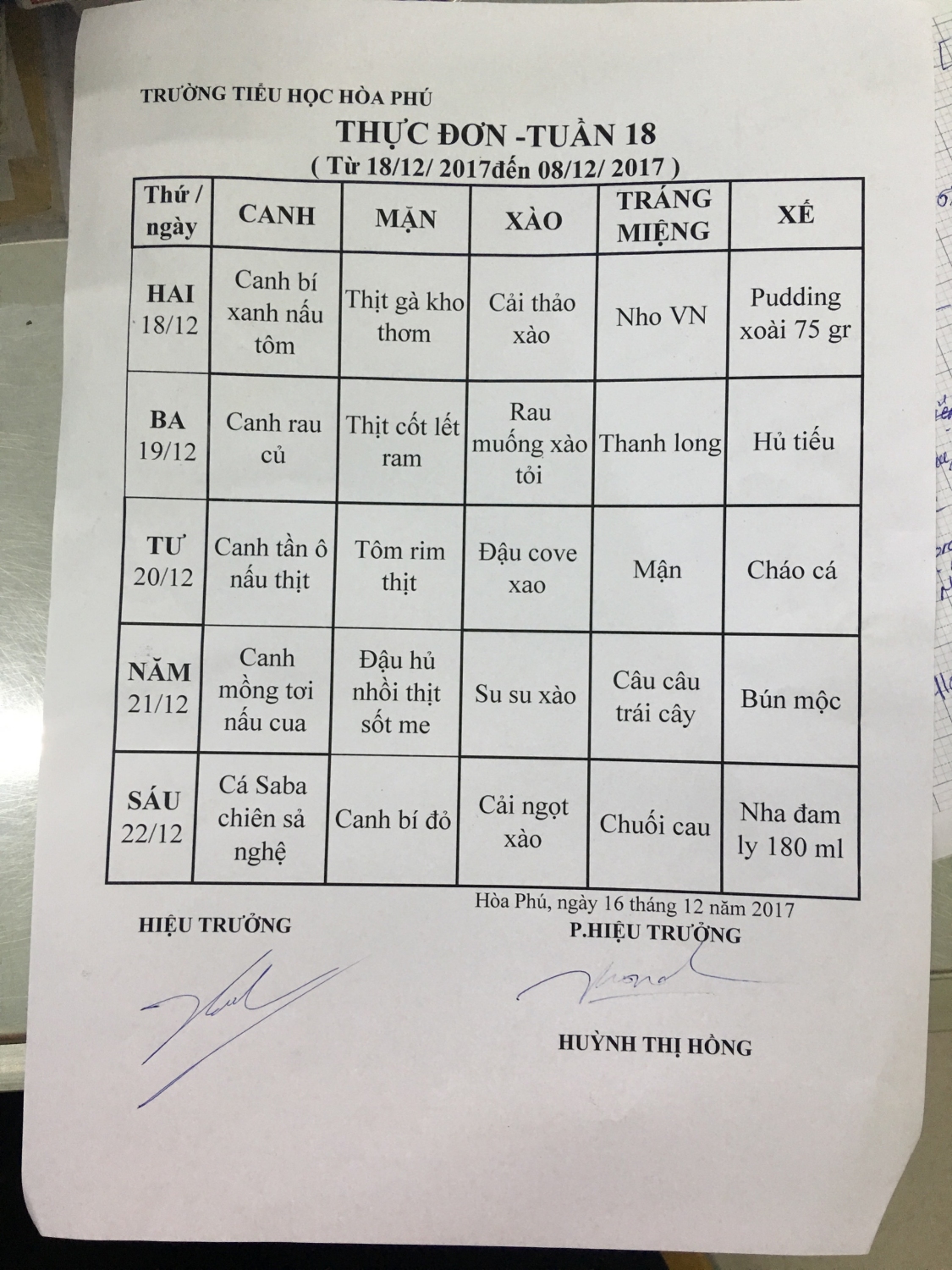 thực đơn tuần 16